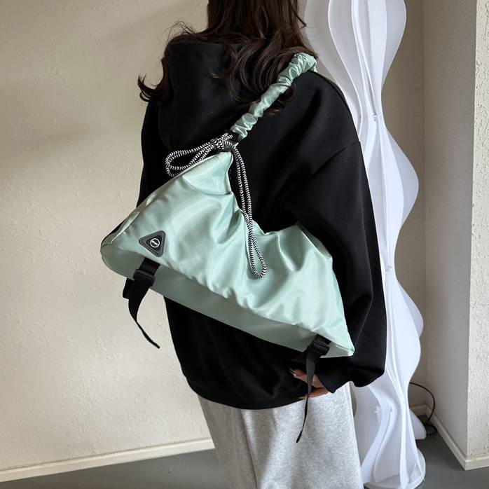 約0.3kgと超軽量ながら、見た目以上の収納力があり、財布・スマホ・コスメ・水筒など必要なものをしっかり収納可能。ドローストリング付きで開閉もスムーズ、さらにサイドポケットも便利で使い勝手抜群。フリル持ち手は肩掛けもラクで、長時間の使用でもストレスを感じさせません。