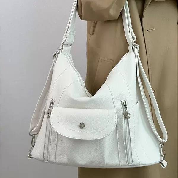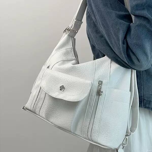 ブラックとホワイトのベーシックな2色展開で、どんなコーデにも合わせやすく、シーズンを問わず使える万能バッグです。ショルダー紐は調節可能で、斜めがけ・肩掛けの2WAYスタイルが楽しめます。軽量かつ柔らかいフェイクレザー素材で、長時間持ち歩いても負担が少ないのも魅力。
