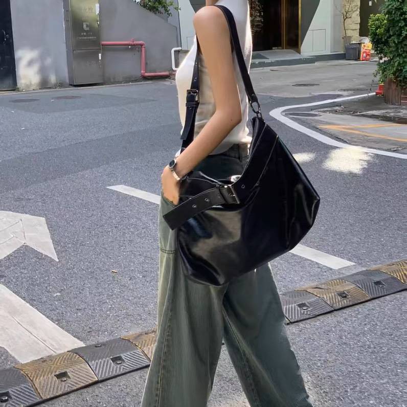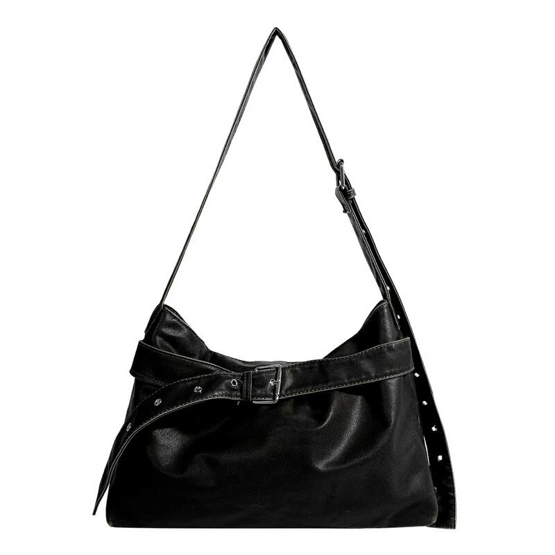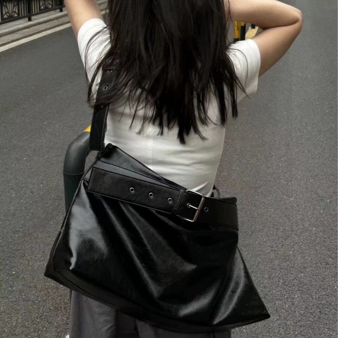 ベルトデザイン ショルダーバッグ 大容量 バッグ 黒 ワンショルダー トート 肩掛け モード系 ストリートコーデ 韓国ファッション 海外トレンド 大人女子 通勤通学 A4収納 ブラック K-B0196
