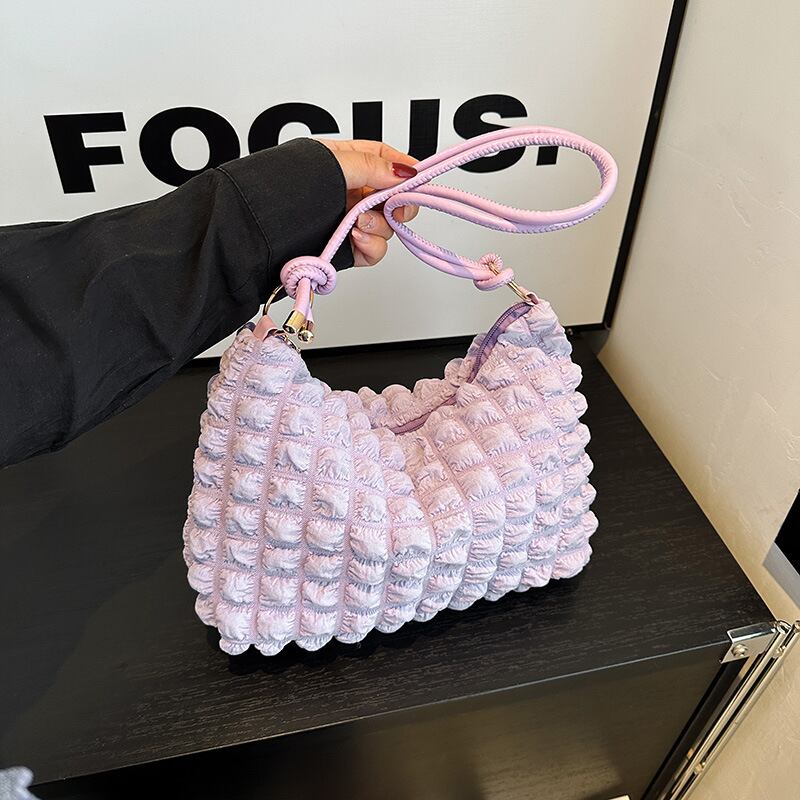 肌触り抜群のふわふわ生地が魅力のワンショルダーバッグ。表面は立体的な格子模様で、シンプルながら個性をプラス。カジュアルからフェミニンなコーデまで幅広くマッチする万能アイテムです。