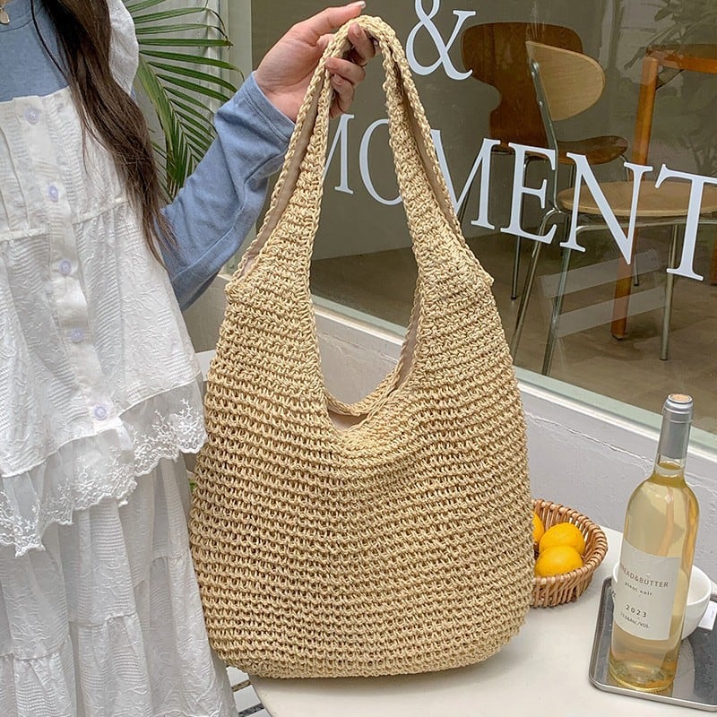ラフィア風バッグ 編みバッグ かごバッグ レディース 肩掛け 大容量 ナチュラル素材 韓国ファッション 春夏 お出かけ デート コーデ おしゃれ 人気 2色展開 K-B0225