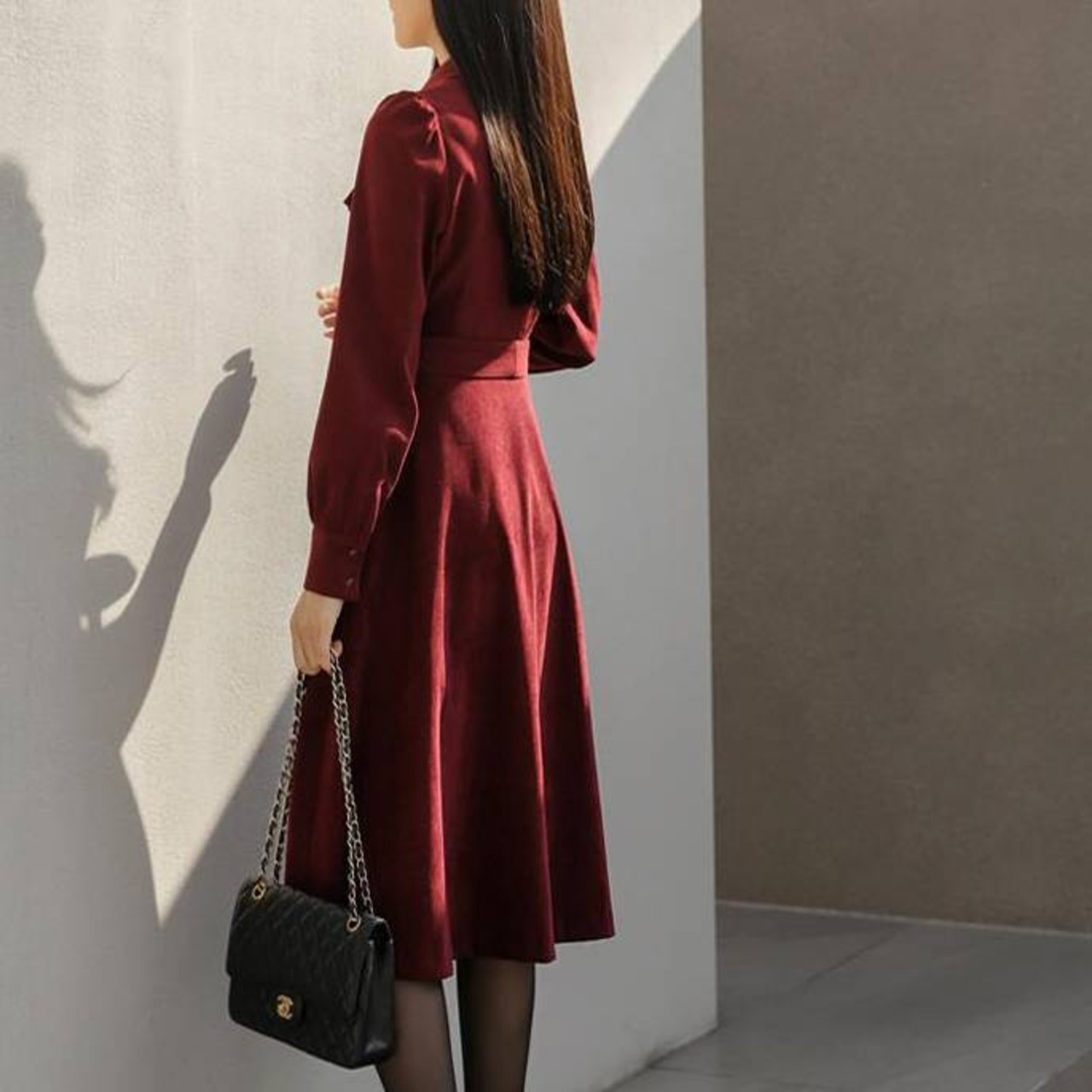 ベルト付き シャツワンピース ミディ丈 長袖 レディース きれいめ 上品 シンプル 無地 フレアワンピース 大人可愛い 韓国風 オフィス 通勤 通学 デート 秋冬 春 着痩せ 美シルエット ベルトリボン ウエストマーク エレガント フォーマル カジュアル ネイビー ボルドー おしゃれ 人気 20代 30代 40代 女性向け ファッション C-OSS0133