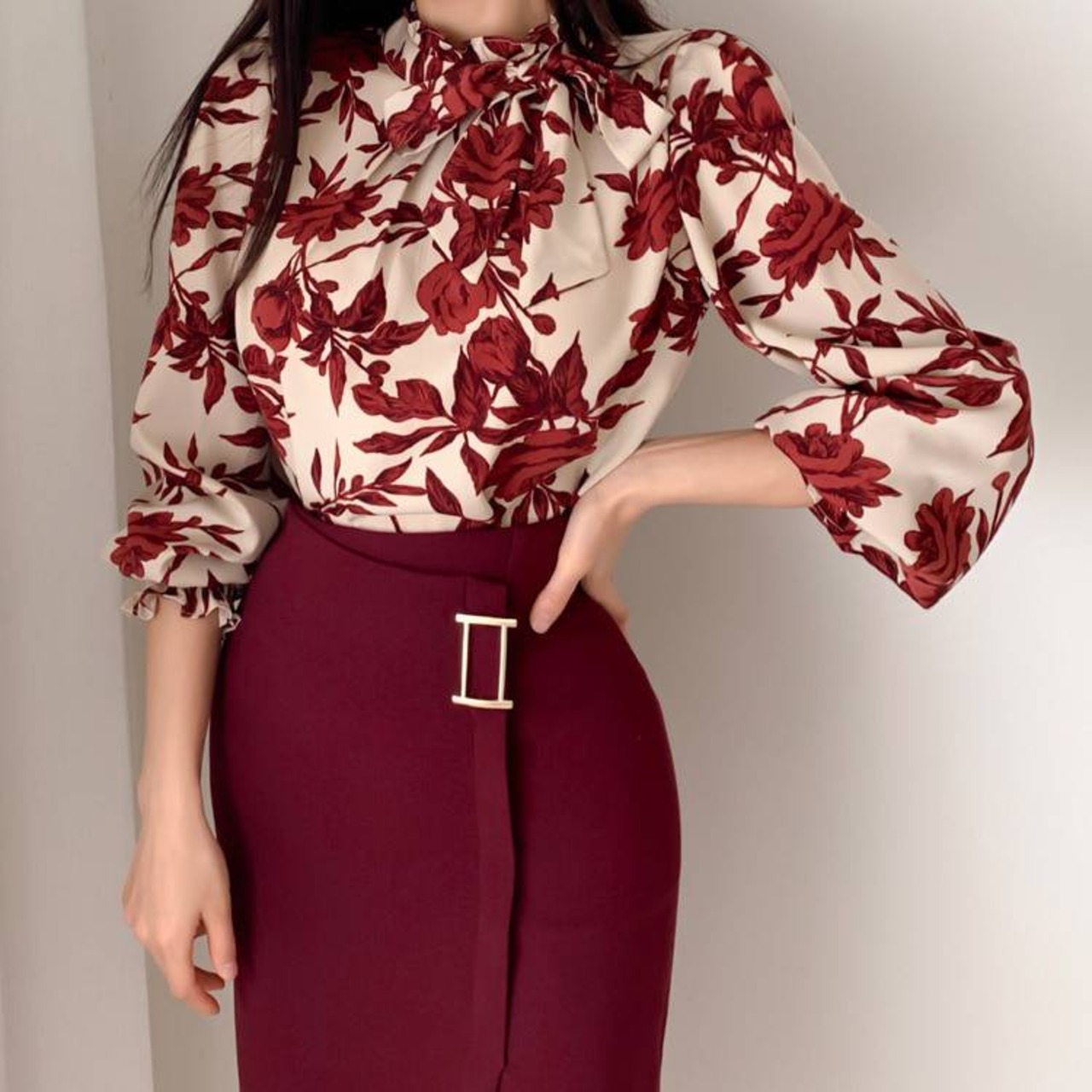 ブラウスのリボンを結んで可愛らしさをプラス。落ち着いた赤が大人の魅力を演出します。