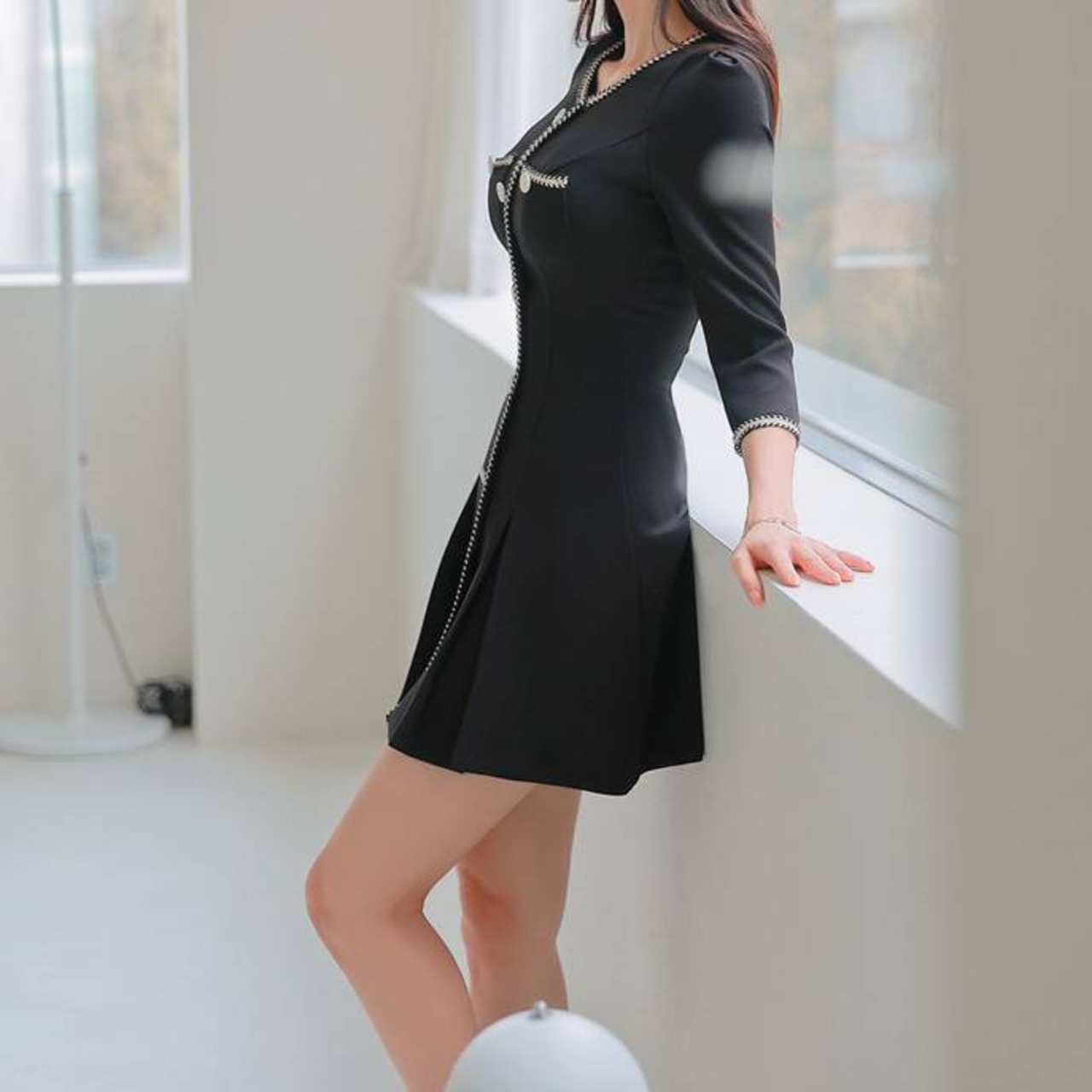 ブラック ワンピース レディース ミニドレス ツイード風 トリムデザイン フレアスカート フロントボタン 長袖風 七分袖 春 夏 秋 冬 韓国風 きれいめ 上品 フォーマル お呼ばれ デート 通勤 オフィス OL 20代 30代 40代 着痩せ 高見え エレガント シンプル 大人フェミニン 人気 C-OSS0146