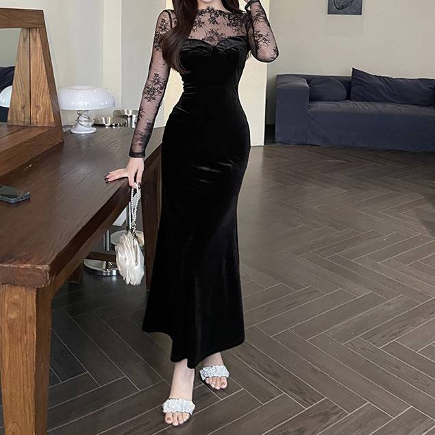 ベロア ロングドレス 黒 レース スリーブ シースルー レディース 上品 高級感 エレガント フォーマル マーメイドライン タイトドレス 韓国風 ワンピース 結婚式 二次会 披露宴 デート 20代 30代 40代 秋 冬 春 パーティー 発表会 お呼ばれ シースルー 長袖 美シルエット 着痩せ 高見え ブラック C-OSS0140