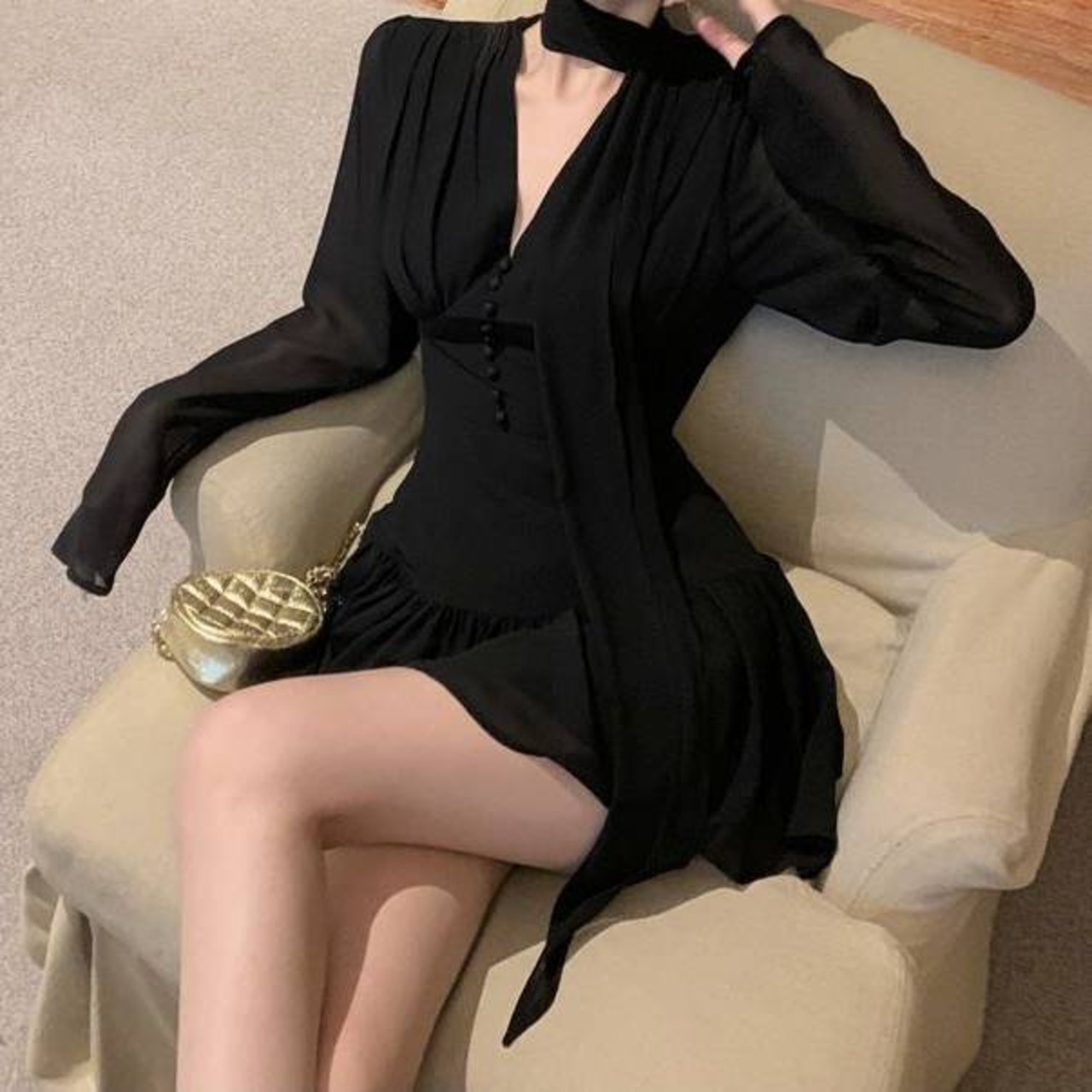 チョーカー風リボンが顔周りを華やかに見せ、トレンド感のあるコーデに。