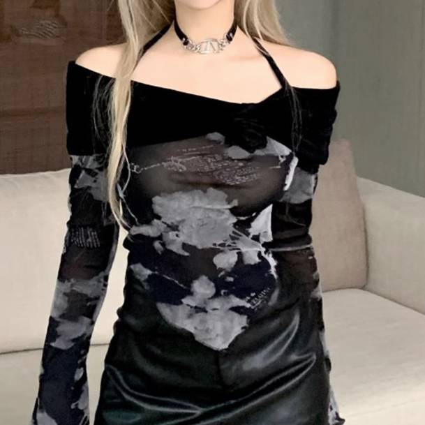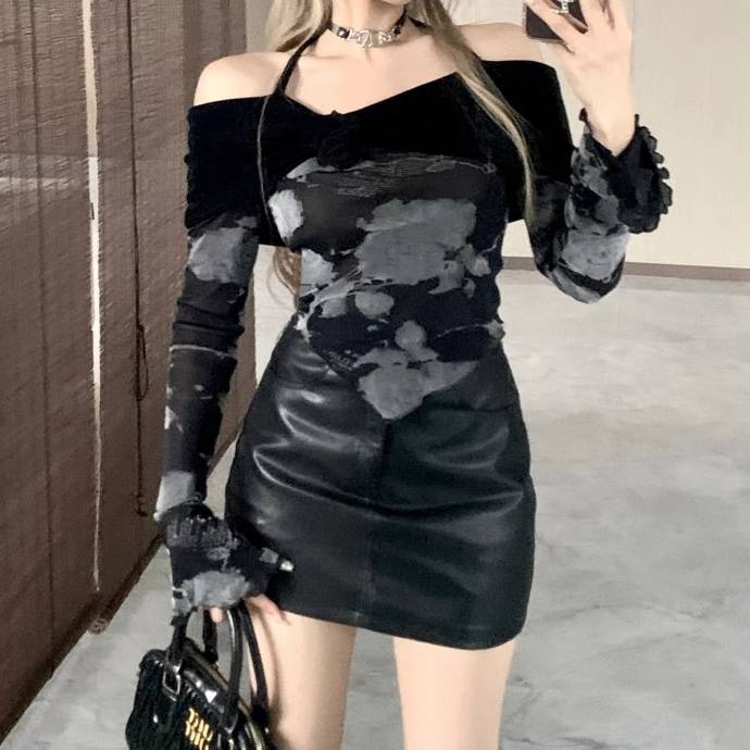 レディース ワンピース オフショルダー 長袖 シースルー メッシュ レザー風 ミニ丈 タイトワンピース 韓国ファッション ブラック クール モード系 セクシー かっこいい おしゃれ Y2K 体型カバー 春 秋 冬 ナイトコーデ クラブファッション デート ストリート 大人女子 S M L XL C-OSS0171