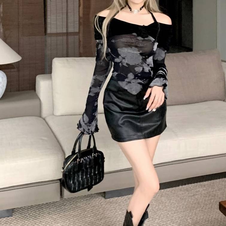 シアー素材のトップスとフェイクレザーのスカート部分を組み合わせた異素材ミックスがトレンド感抜群。