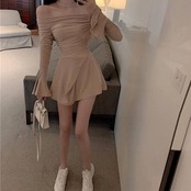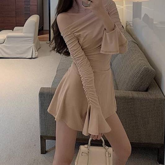レディース ワンピース オフショルダー フレアスリーブ 長袖 ミニ丈 きれいめ セクシー Aライン スリム 体型カバー 春 秋 冬 韓国ファッション 大人可愛い 上品 デートコーデ 二次会 ブラック カーキ 2色展開 S M L 女性らしい美シルエット ミニドレス C-OSS0170