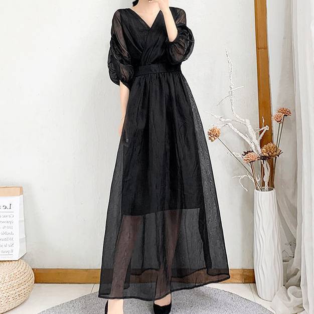 透け感のあるシアー素材が上品な印象を与えるロングワンピース。