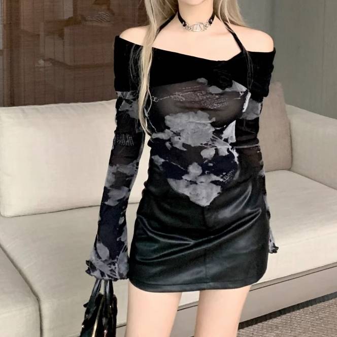 レディース ワンピース オフショルダー 長袖 シースルー メッシュ レザー風 ミニ丈 タイトワンピース 韓国ファッション ブラック クール モード系 セクシー かっこいい おしゃれ Y2K 体型カバー 春 秋 冬 ナイトコーデ クラブファッション デート ストリート 大人女子 S M L XL C-OSS0171