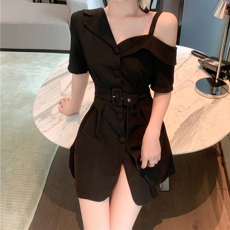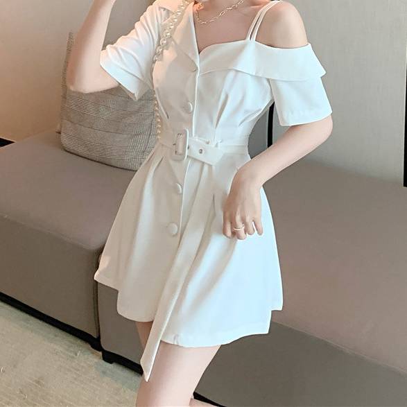 レディース ワンピース オフショルダー ベルト付き ショート丈 半袖 2WAYデザイン フロントボタン セクシー 大人可愛い 韓国ファッション 春 夏 秋 通勤 デート カジュアル きれいめ ブラック ホワイト 2色展開 S M L XL 体型カバー ミニワンピース C-OSS0168