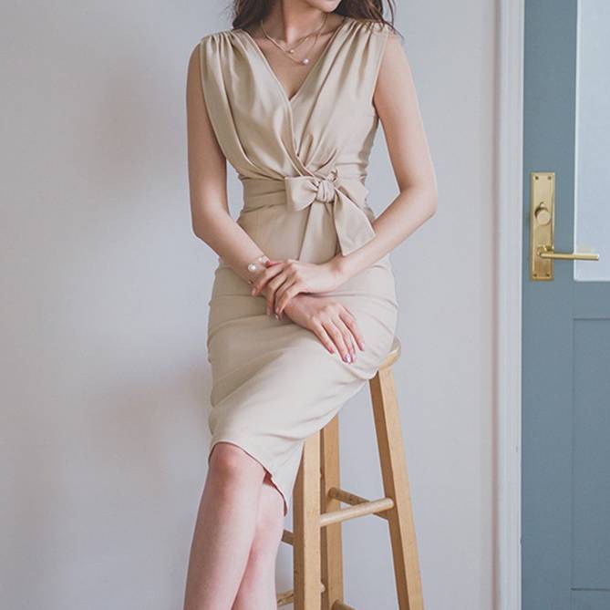 ワンピース レディース タイトワンピース ノースリーブ ウエストリボン 上品 きれいめ 美シルエット エレガント 清楚 大人可愛い セクシー 韓国風 パーティー 二次会 デート フォーマル 通勤 春 夏 秋 冬 20代 30代 40代 人気 ベージュ C-OSS0159