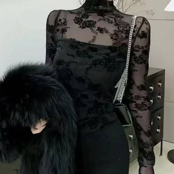 シースルートップス レーストップス ハイネック長袖タイトトップス 透け感 セクシー ブラック 大人上品 着痩せ 韓国風コーデ ナイトアウト デートコーデ クラブ 衣装 レディース ファッション C-OSS0229