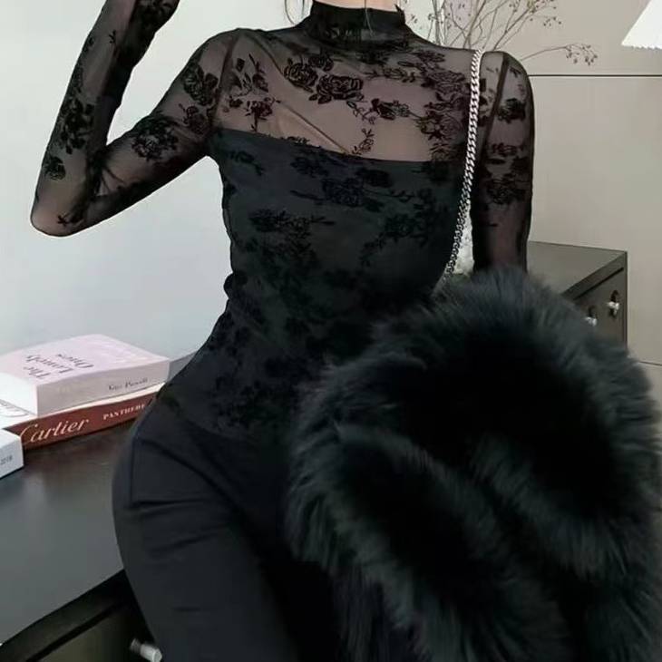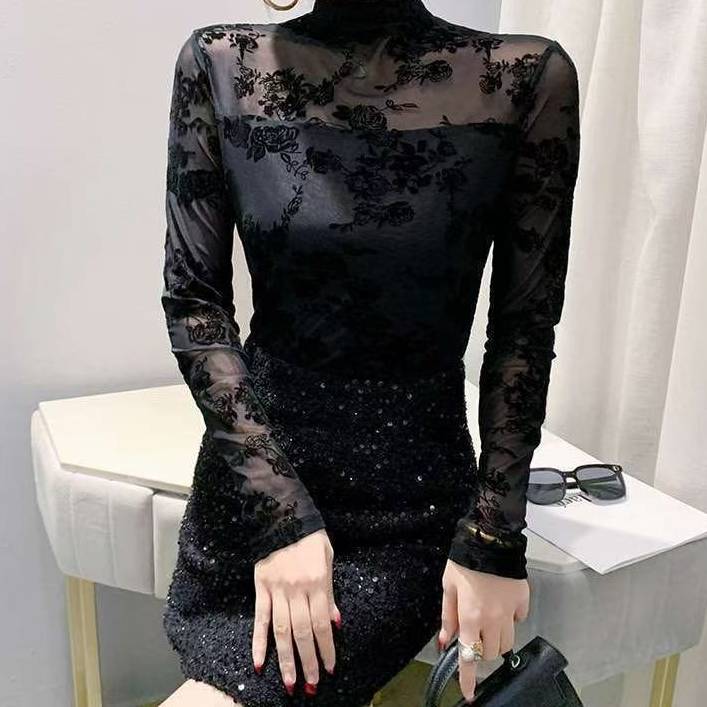 商品名:シースルーフラワーレース ハイネックトップス 長袖タイトシルエット