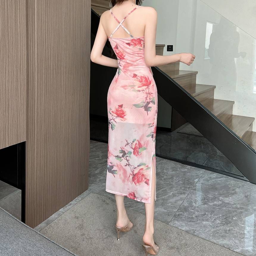 フラワープリント マーメイド ベアワンピース スリット入り キャミドレス タイトロングドレス 大人上品 デート ホテルディナー 写真映え ピンク C-OSS0228