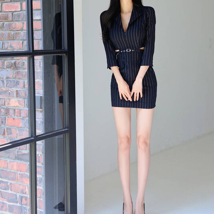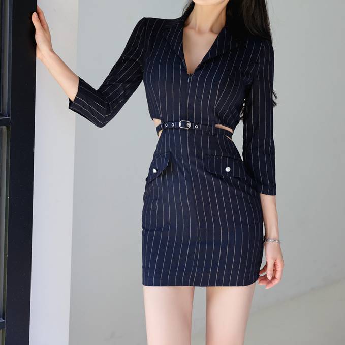 ネイビーブラック ワンピース レディース ミニワンピース タイトワンピース ストライプ 七分袖 ベルト付き 美シルエット スリム フォーマル エレガント セクシー 韓国ファッション 上品 大人可愛い デート パーティー 通勤 オフィス 春 夏 秋 冬 人気 トレンド C-OSS0215