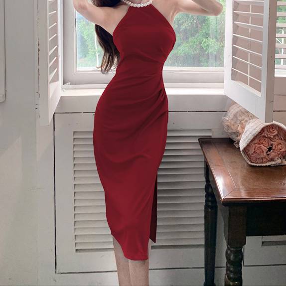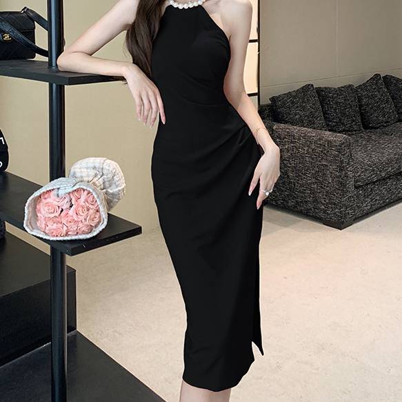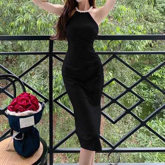 ブラック レッド ピンク ホワイト ワンピース レディース ミディ丈ワンピース ノースリーブ ドレス タイトドレス ハイネック パールネック エレガント 上品 セクシー 大人きれい 体型カバー 美シルエット 結婚式 二次会 パーティー デート 韓国ファッション 人気 トレンド 春 夏 秋 冬 C-OSS0211