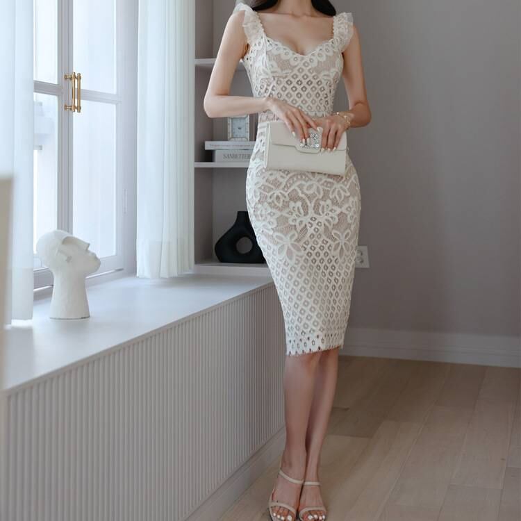ホワイト ワンピース レディース レースワンピース ノースリーブ タイト ミディ丈 フェミニン エレガント 上品 高級感 パーティー 二次会 デート お呼ばれ 結婚式 清楚 美ライン 体型カバー 大人可愛い 韓国ファッション 春 夏 秋 トレンド 人気 ドレススタイル C-OSS0207