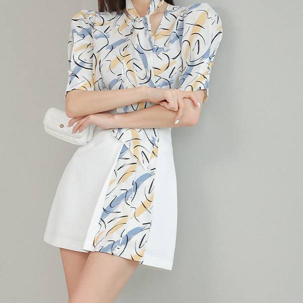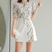 商品名:ホワイト アシンメトリーデザイン プリントブラウス ミニスカート風 ワンピース