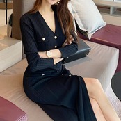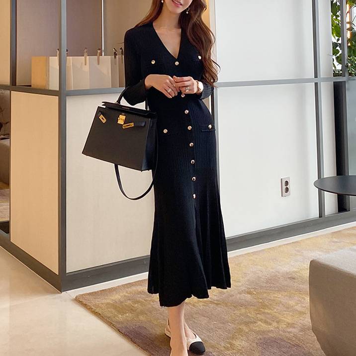 商品名:ゴールドボタン リブニット ワンピース ロングスリーブ タイトドレス