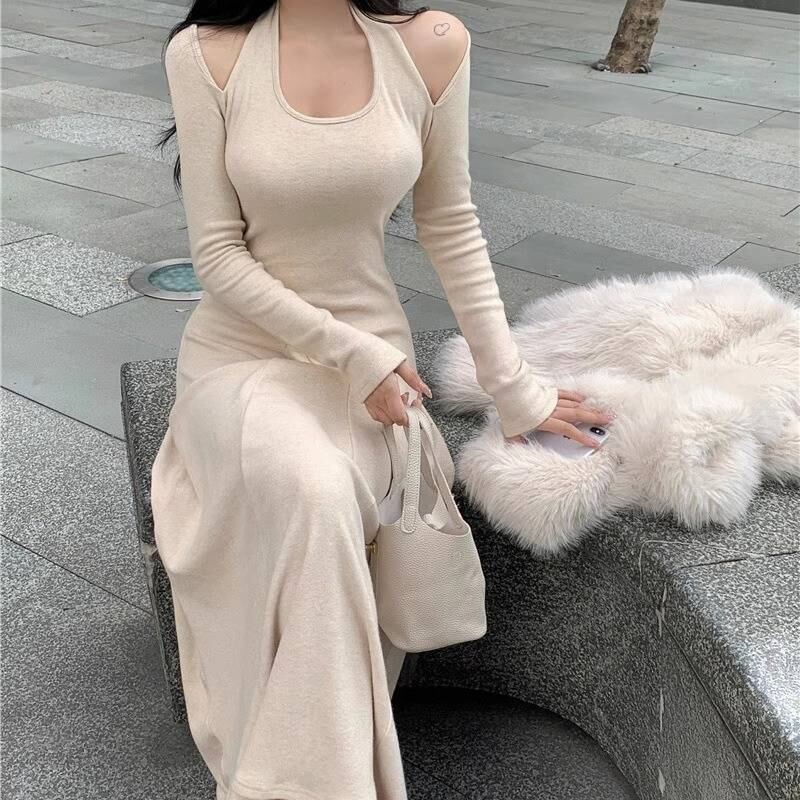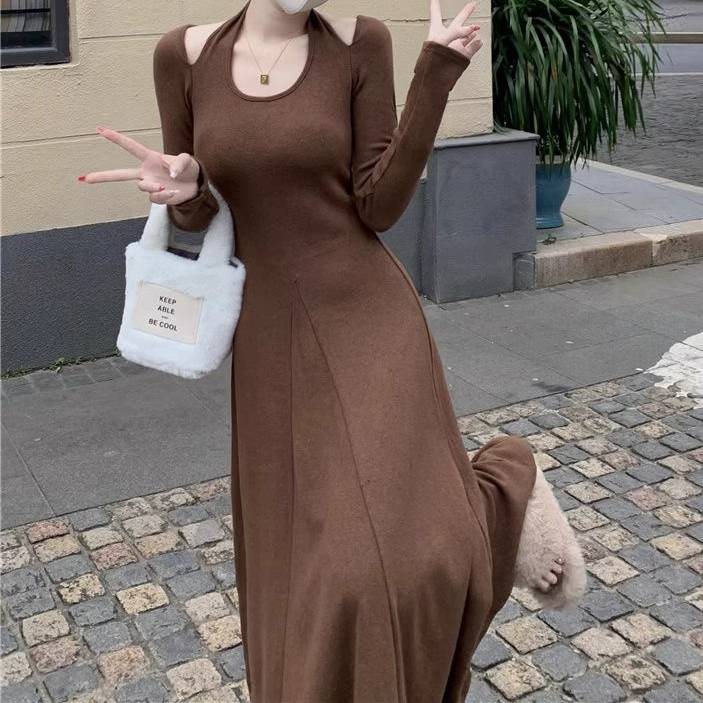 ワンピース ロングワンピース 秋冬 ニットワンピース カットアウト 肩あき ロング丈 シンプル 大人可愛い 韓国風 レディース きれいめ 上品 おしゃれ 可愛い フレア 長袖 体型カバー 美シルエット Aライン ブラウン ホワイト ベージュ 20代 30代 40代 カジュアル デート お出かけ 冬ワンピ C-OSS0221
