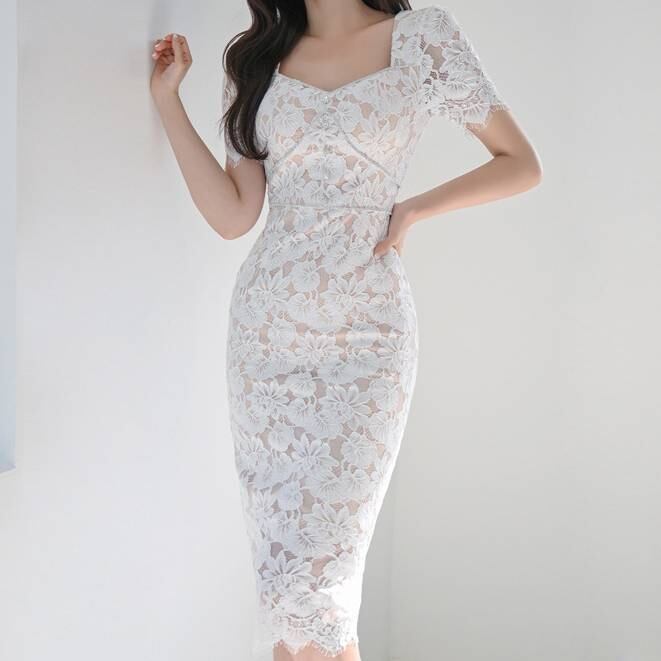 ホワイト ワンピース レディース レースワンピース フラワーレース タイトワンピース ミディ丈 エレガント 上品 清楚 韓国ファッション 春 夏 秋 結婚式 二次会 お呼ばれ デート 体型カバー 美シルエット 大人可愛い 高級感 トレンド 人気 ドレススタイル C-OSS0208