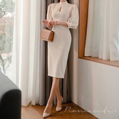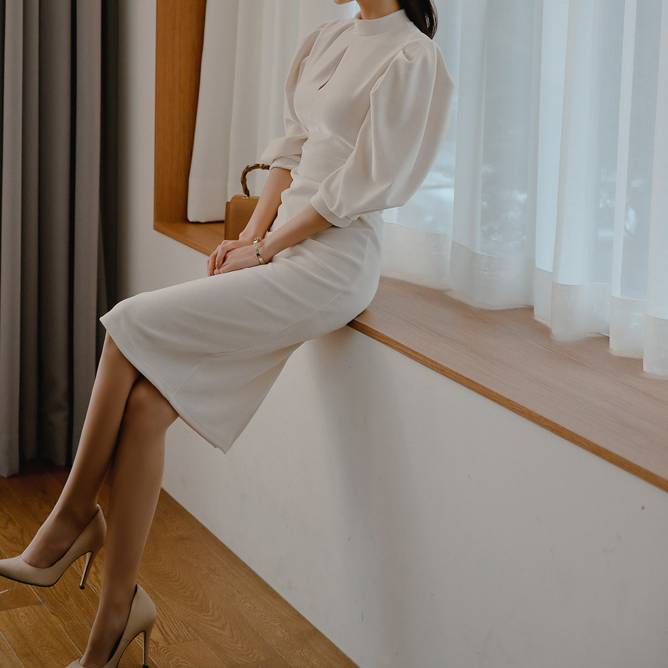 ホワイト ワンピース レディース ミディ丈 タイトワンピース パフスリーブ 長袖 ハイネック 上品 エレガント シンプル きれいめ 韓国ファッション 春 秋 冬 オフィス 通勤 デート お呼ばれ 二次会 パーティードレス 高級感 清楚 美シルエット 着痩せ 人気 トレンド C-OSS0201