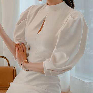 デコルテに控えめなスリットを施したハイネックデザインが洗練された印象を演出し、程よいボリューム感のあるパフスリーブが女性らしさを引き立てます。
