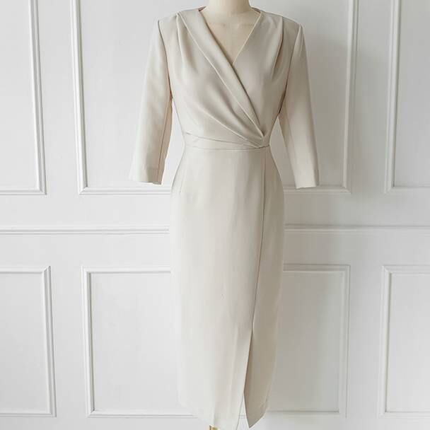 上品なカシュクールデザインがデコルテを美しく見せ、ボディラインにフィットするシルエットがエレガントな印象を演出します。