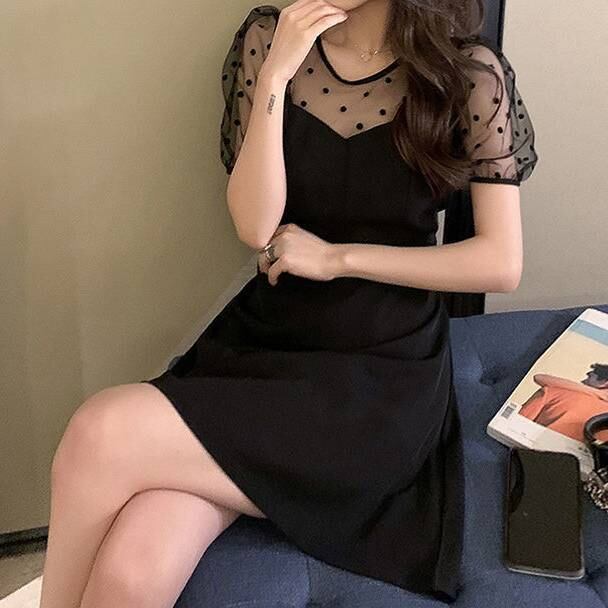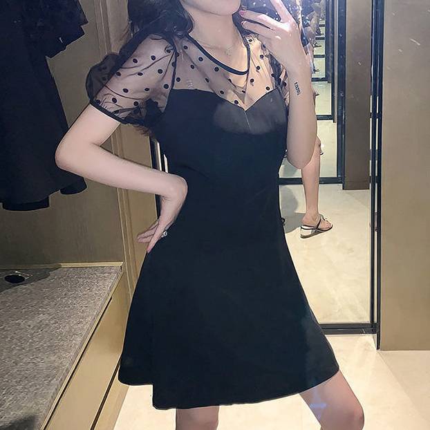 ブラック ワンピース レディース ドットチュール フレアドレス ミニ丈 シースルースリーブ 可愛い 上品 エレガント 体型カバー Aライン 透け感 お呼ばれ パーティードレス 二次会 デート フォーマル 韓国風 ファッション 春 夏 秋 冬 大人女子 トレンド 人気 着痩せ おしゃれ 清楚 C-COSS0190