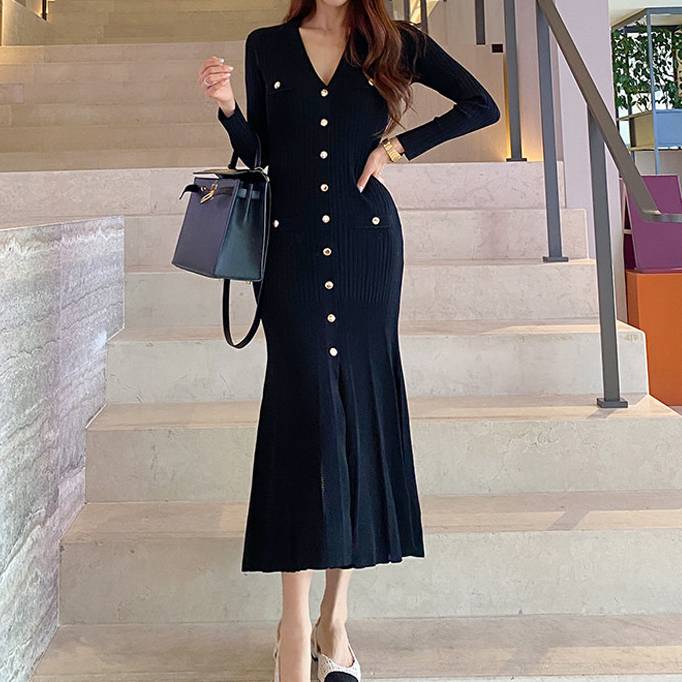 リブニット ワンピース ロング丈 Vネック ゴールドボタン タイトワンピース ブラック レディース 長袖 ドレス 上品 大人可愛い エレガント シンプル きれいめ 通勤 オフィス カジュアル デート 秋冬 春 着やせ効果 美ライン 大人女子 20代 30代 40代 フォーマル モード C-OSS0183