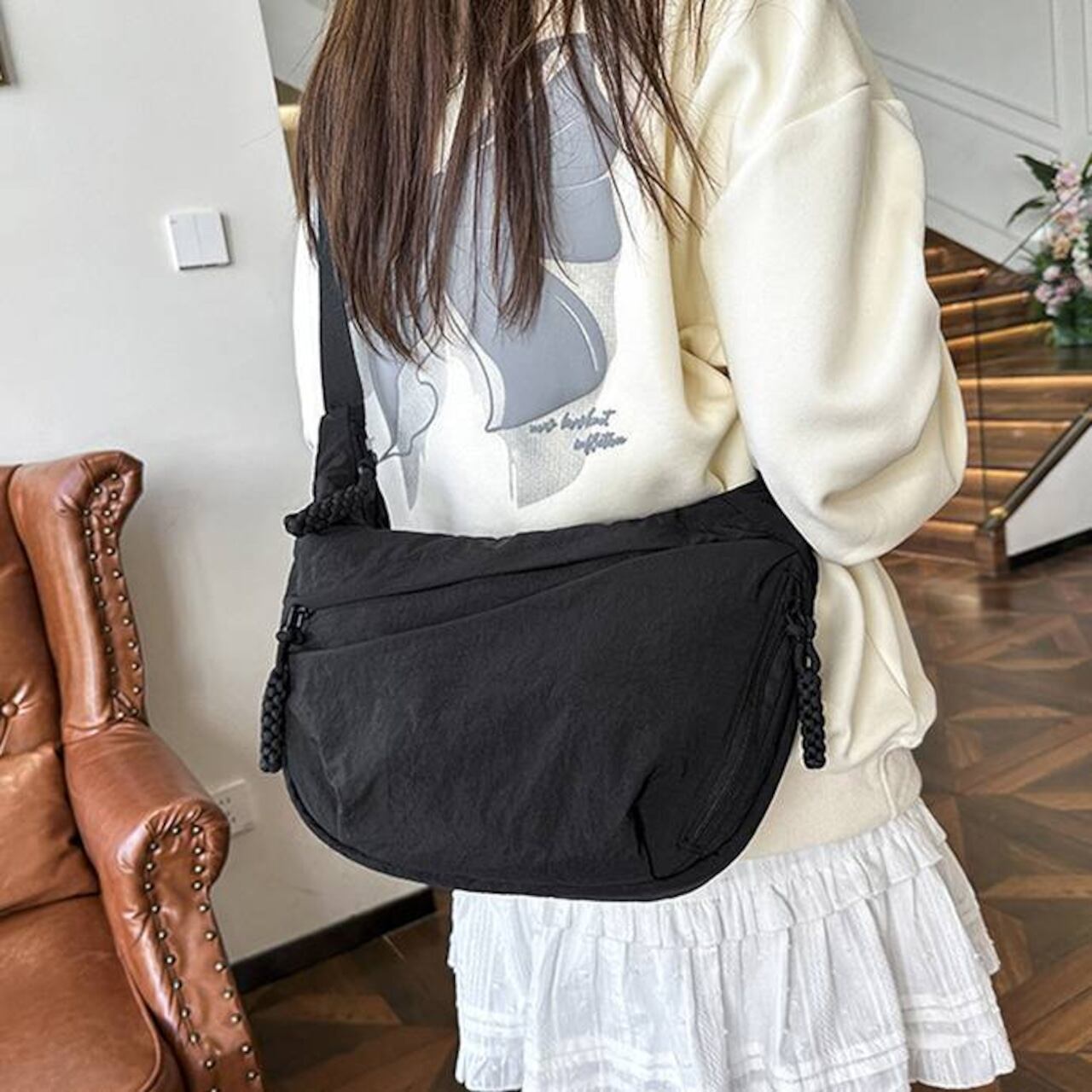 毎日のコーデにすっとなじむ、軽量でやわらかなナイロンクロスボディバッグ。シンプルな無地デザインと程よいボリューム感で、カジュアルからナチュラル、韓国ファッションまで幅広いスタイルにマッチします。身体に沿うようなフォルムで、長時間の外出でもストレスなく使えるのが魅力です。