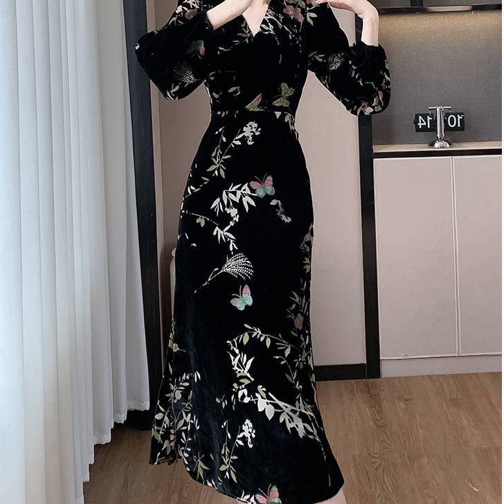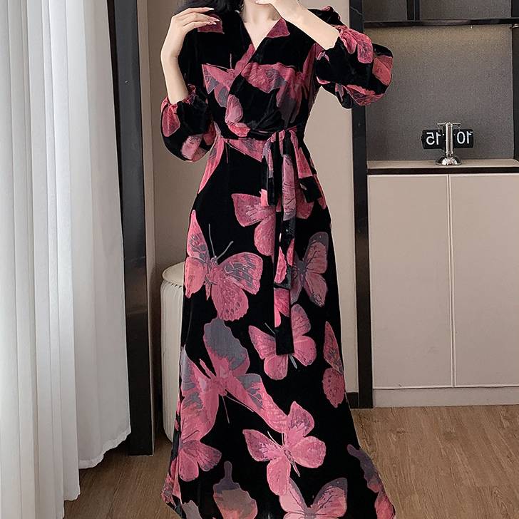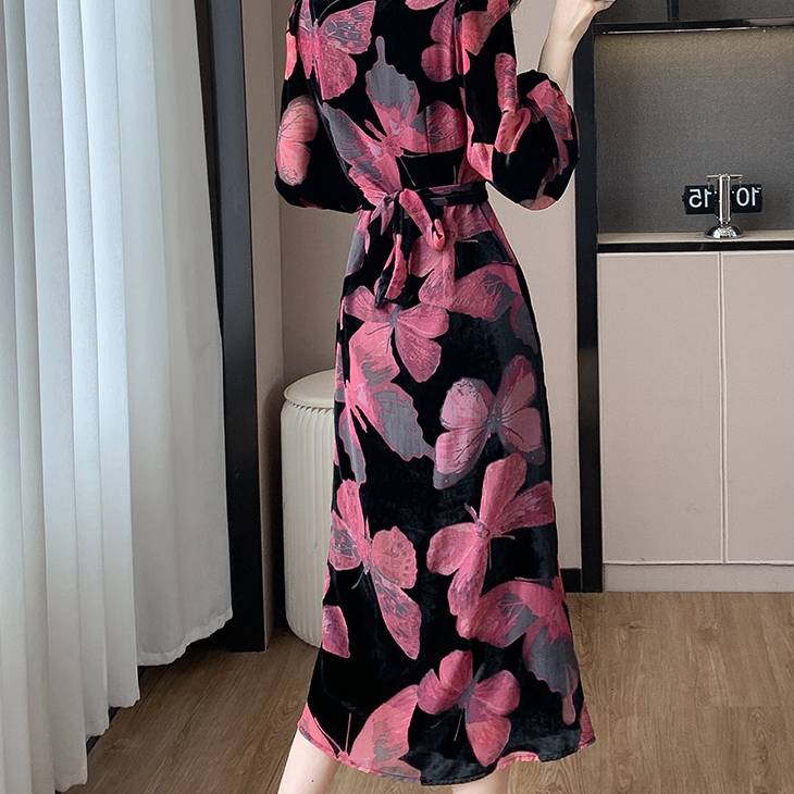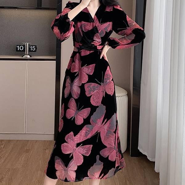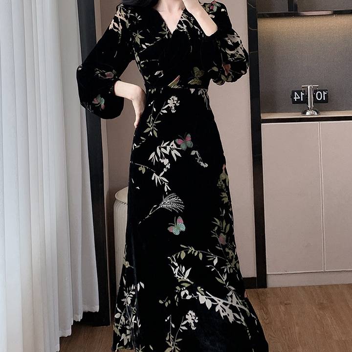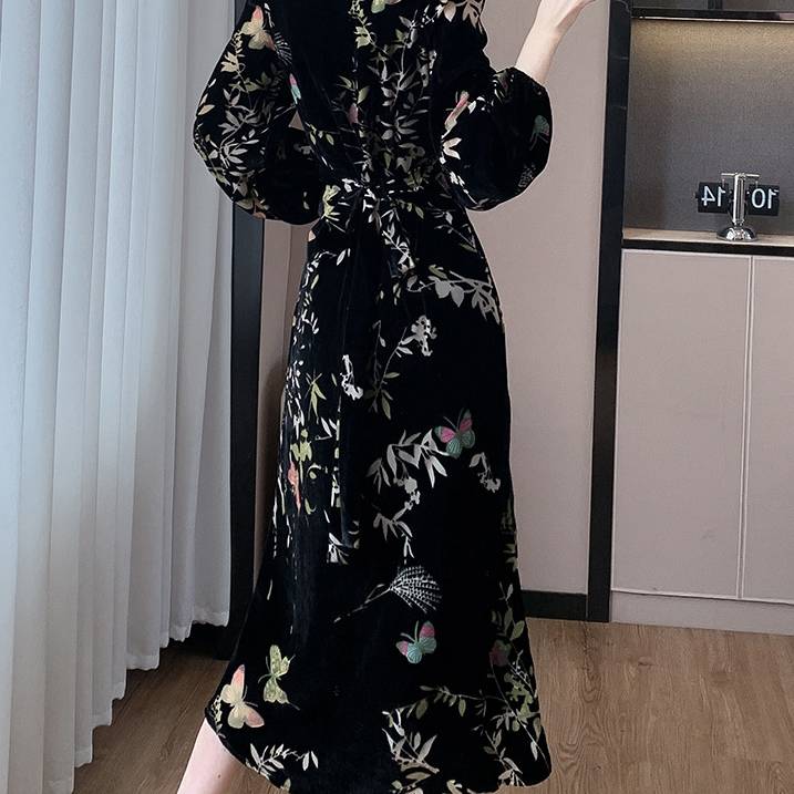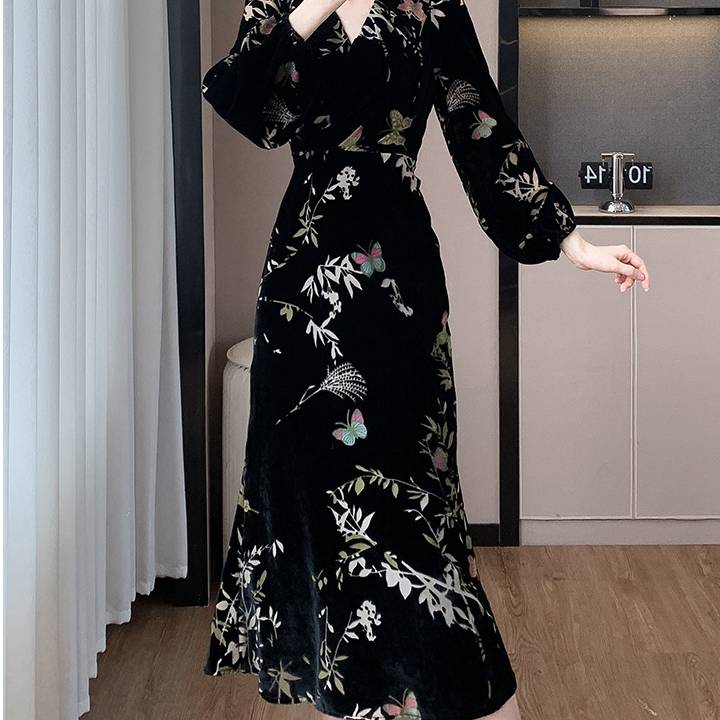 美しい光沢を放つベロア素材に、繊細な花柄・蝶柄を組み合わせた上品なロングワンピース。動くたびにしなやかに揺れるAラインシルエットが、女性らしさを自然に引き立て、大人の余裕とエレガンスを感じさせます。長袖デザインは秋冬シーズンにもぴったりで、季節感のある着こなしを楽しめます。