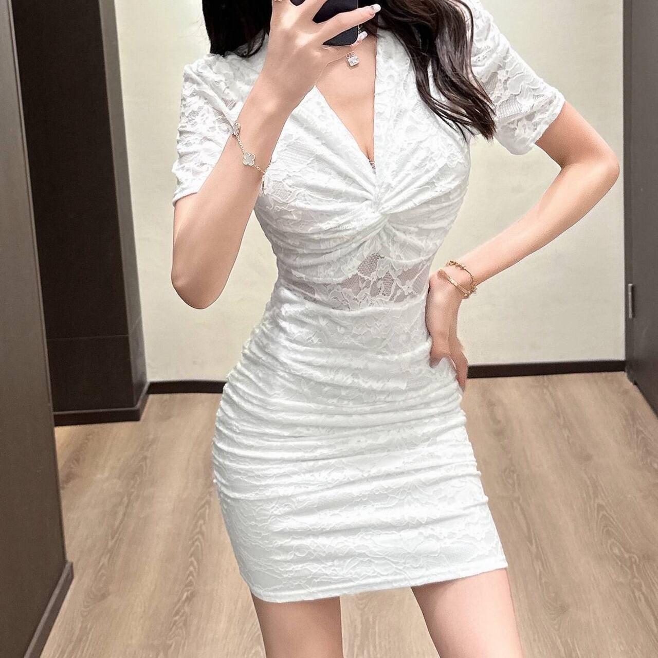 レースタイトワンピース フロントツイストワンピース セクシーミニワンピース レディース タイト ワンピース ミニ丈 パーティー ドレス 結婚式 二次会 デート お呼ばれ 体型カバー スタイルアップ 上品 透け感 ブラック ホワイト 春夏 秋冬 韓国風 大人可愛い トレンドファッション 人気 K-OSS0254