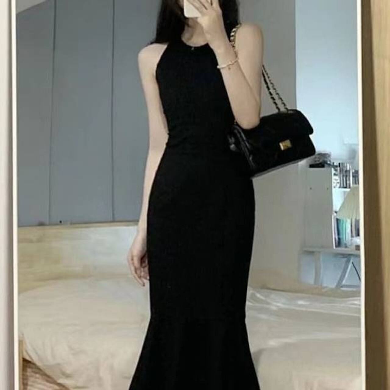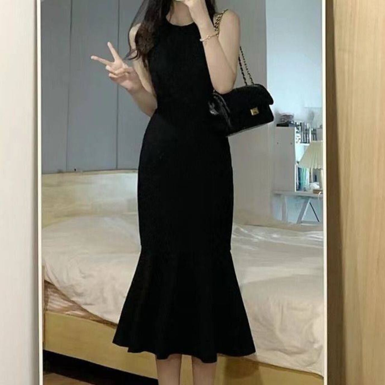 ヒールとクラッチバッグを組み合わせるだけでフォーマルシーンに対応。体に沿うタイトラインがエレガントな雰囲気を演出し、裾のマーメイドが動きに合わせて美しく揺れるのでパーティーにも最適です。