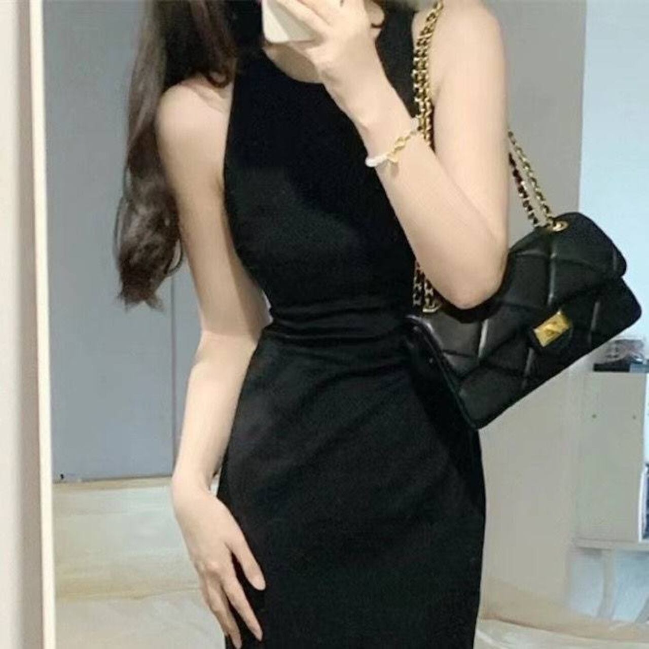 細めのゴールドアクセやチェーンバッグを合わせれば、上品さを引き立てつつ華やかさもプラス。黒ワンピが体のラインを美しく見せてくれるため、シンプル小物だけでも完成度の高いデートコーデになります。