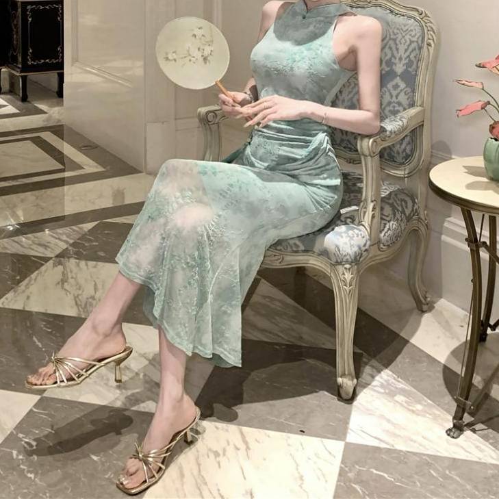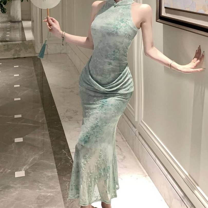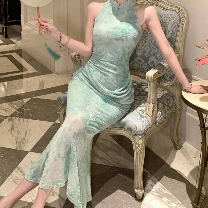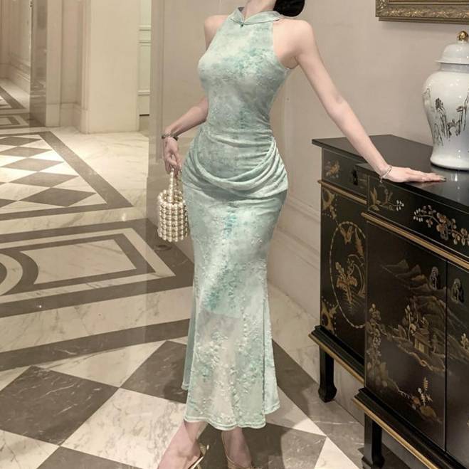 上品な透け感と、身体のラインを美しく引き立てるチャイナ風ホルターネックデザインのロングドレスです。淡いライトブルーカラーが清涼感と女性らしさを演出し、特別なシーンでも印象的なスタイルを完成させます。