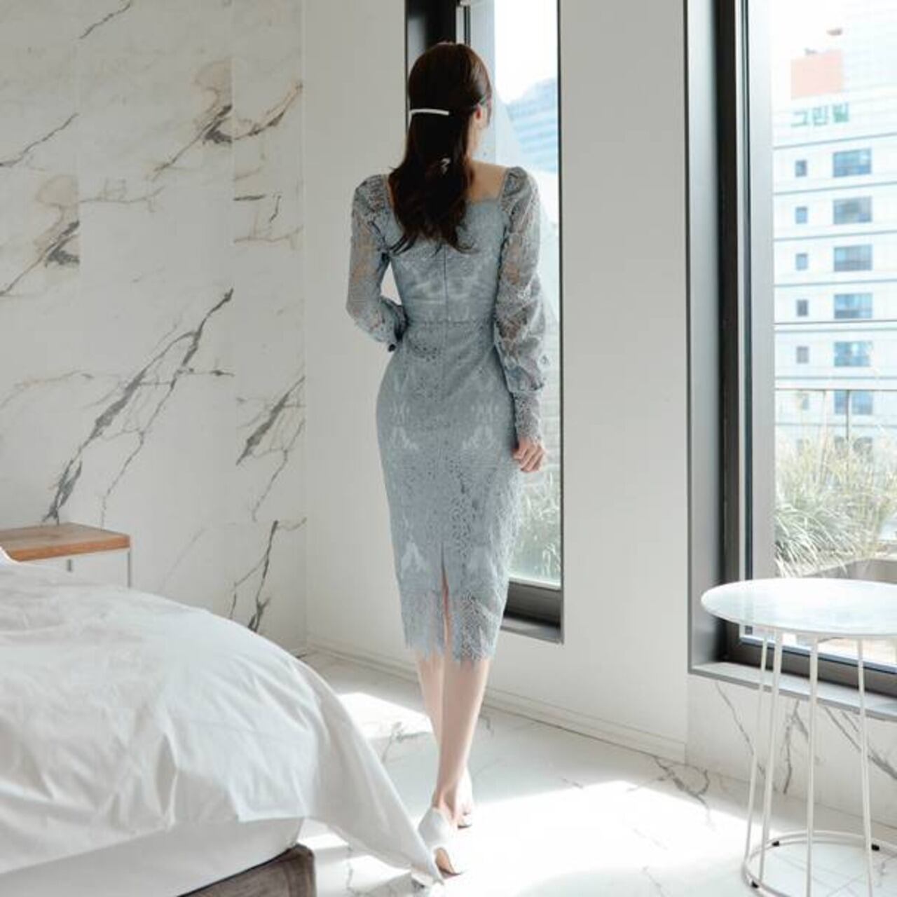 レースタイトドレス スクエアネック ワンピース ミモレ丈 タイトドレス 長袖レース エレガント 大人可愛い きれいめ 上品 パーティードレス 結婚式 二次会 お呼ばれ ドレス ワンピース ブルー フォーマル 韓国風 キレイ系 体型カバー 美シルエット スリムフィット レディース 春夏 秋冬 デート 食事会 発表会 同窓会 大人女子 上品ワンピース C-OSS0255