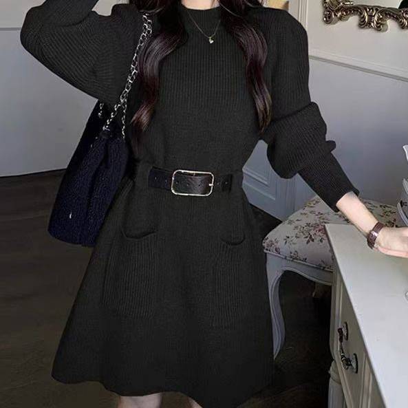 ベルト付き ニットワンピース 体型カバー 防寒 Aライン ワンピース レディース 秋冬 コーデ きれいめ 上品 大人可愛い 着痩せ 効果 通勤 デート お出かけ ブラック ダークブラウン カーキ レッド ベージュ C-OSS0250