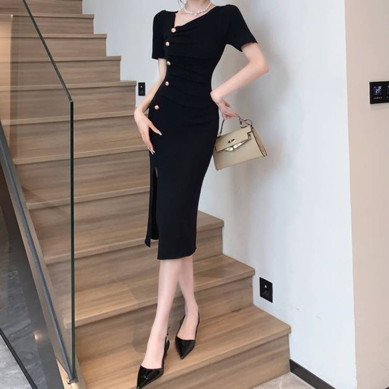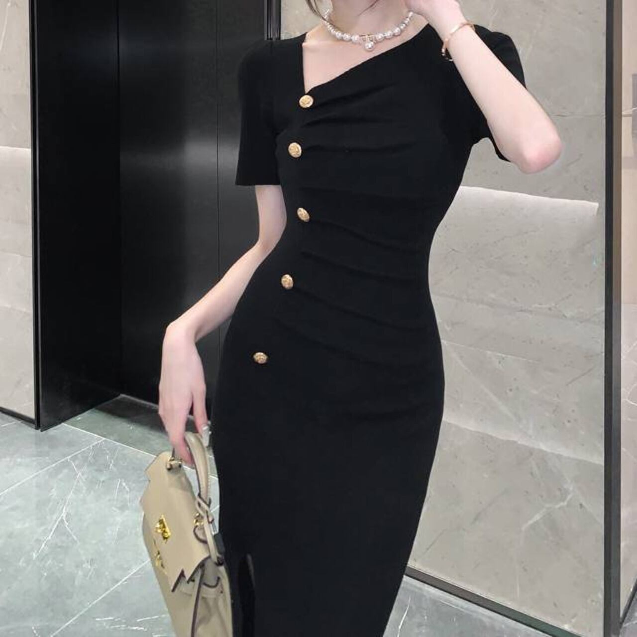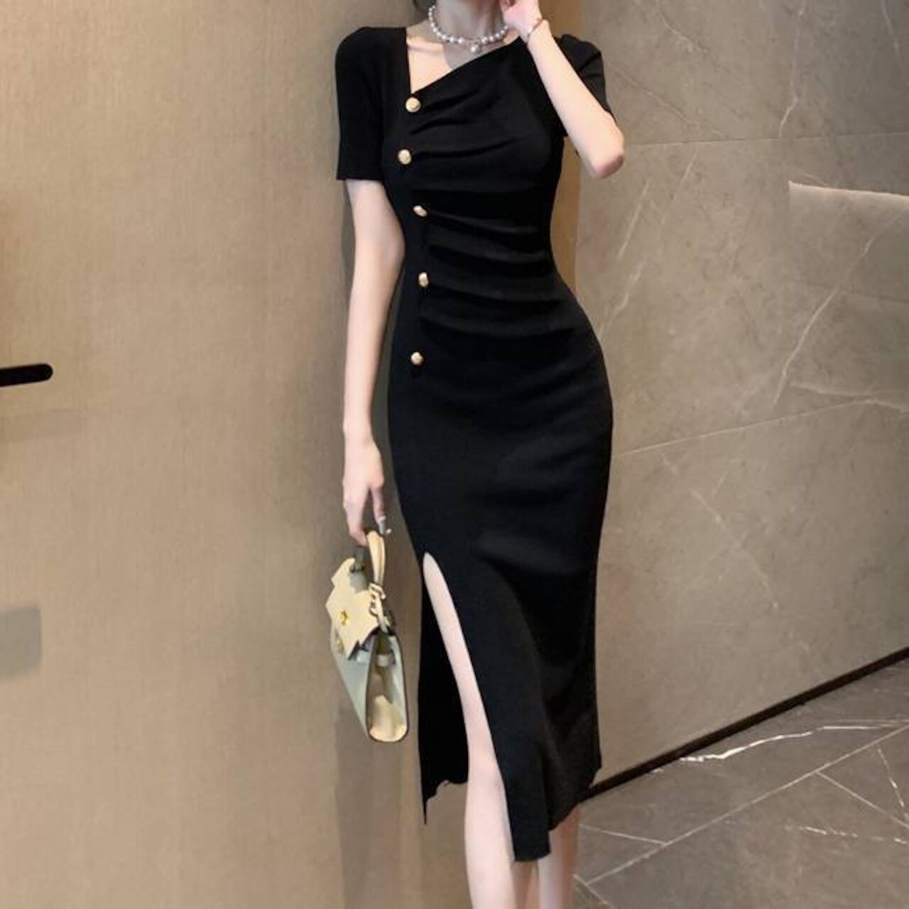 エレガント アシンメトリー スリット ワンピース タイトワンピース レディース ブラック 上品 韓国風 お呼ばれ 二次会 パーティー 食事会 デート 大人 セクシー スタイリッシュ きれいめ ワンピース C-OSS0243