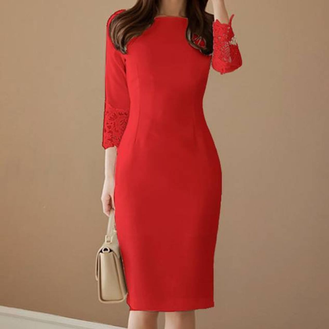 エレガンススリムライン ワンピース タイトワンピース 七分袖 レーススリーブ 体型補正 美ライン ブラック レッド ホワイト 上品 清楚 きれいめ 大人可愛い パーティー 結婚式 二次会 デート 通勤 韓国風 フォーマル シンプル 洗練デザイン ワンタイプ C-OSS0242