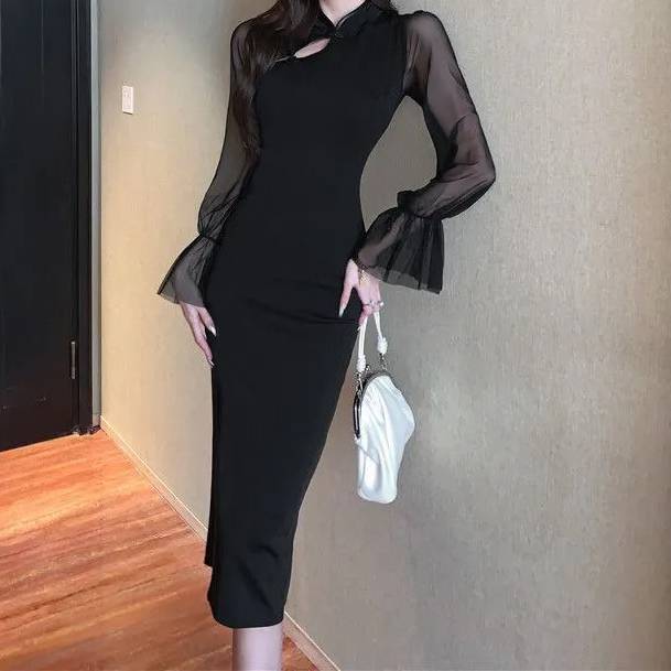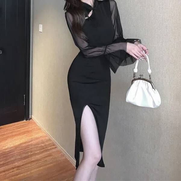 スリットワンピース シースルー袖 タイトワンピース ブラック ドレス 大人可愛い セクシー 上品 エレガント パーティー ワンピ 結婚式 二次会 デート お呼ばれ 韓国風 トレンド レディース 体型カバー 美脚 美シルエット 5サイズ展開 C-OSS0240