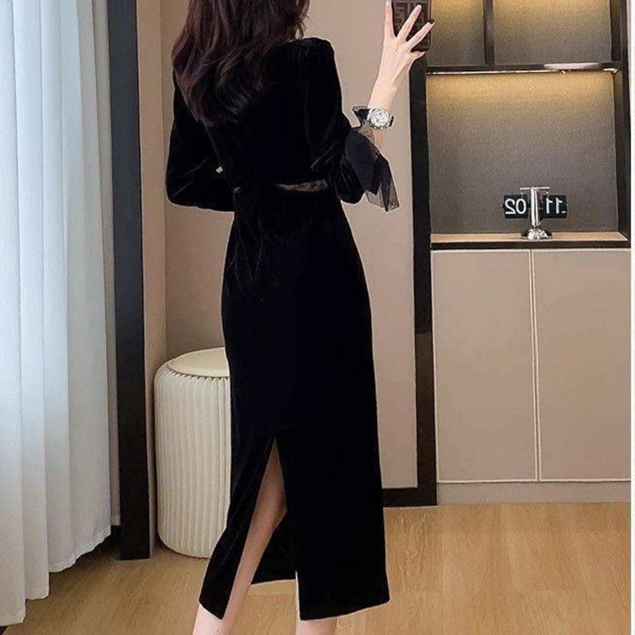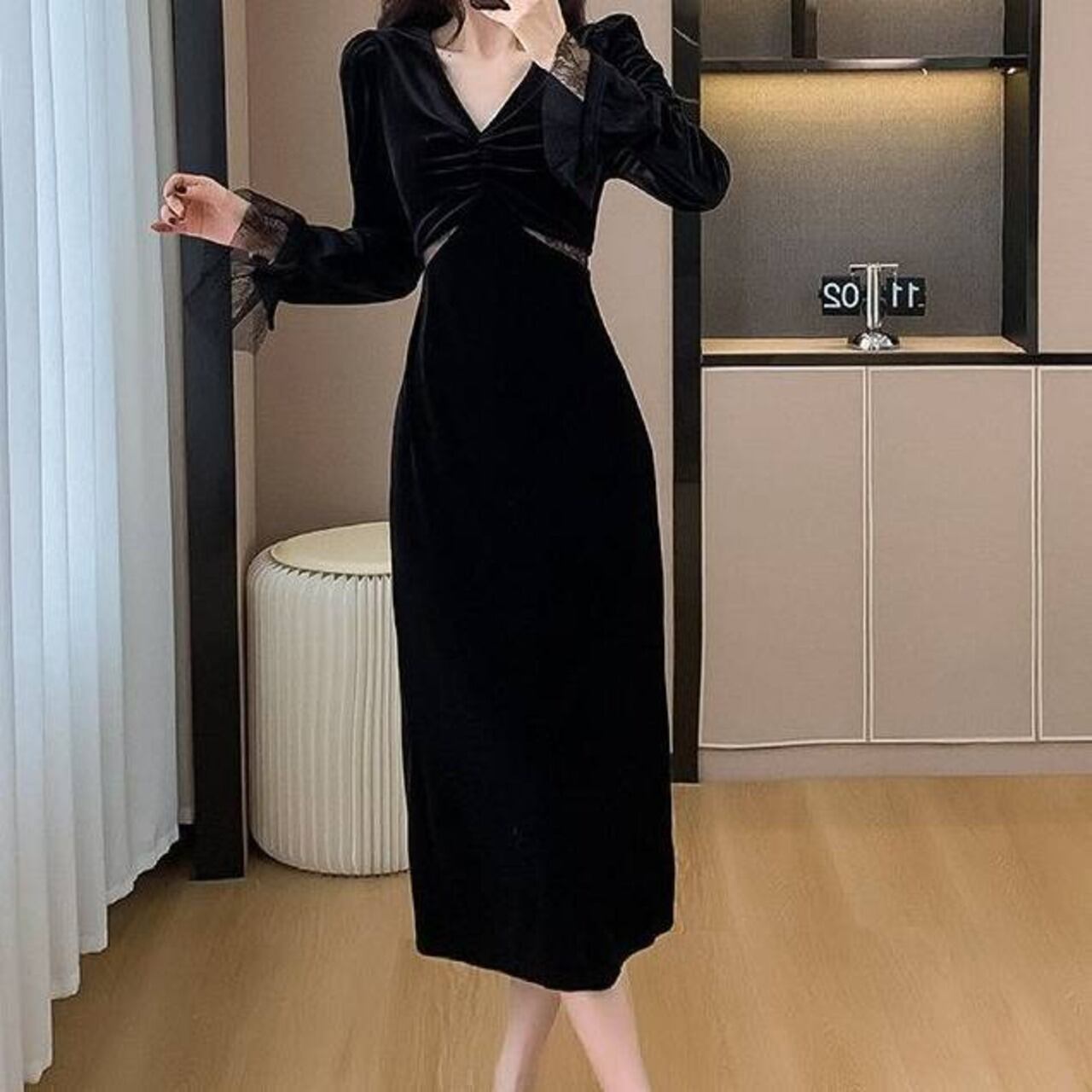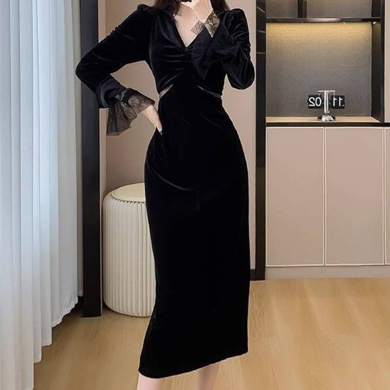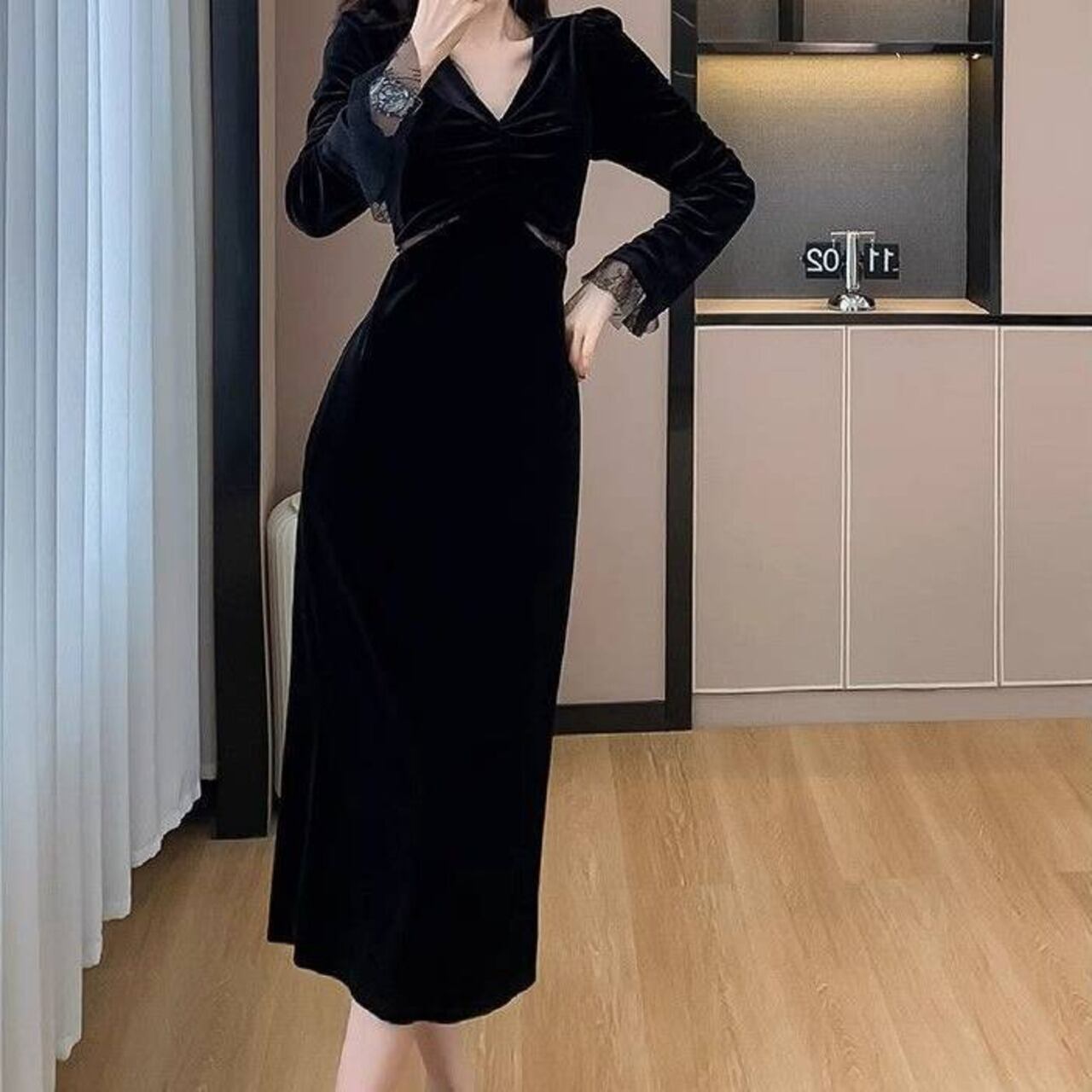 エレガント ベルベット ロングワンピース Vネック タイトシルエット ワンピース ドレス パーティー 秋冬 春 夏 体型カバー 上品 大人フェミニン ブラック レディース ロング丈 美ライン C-OSS0235