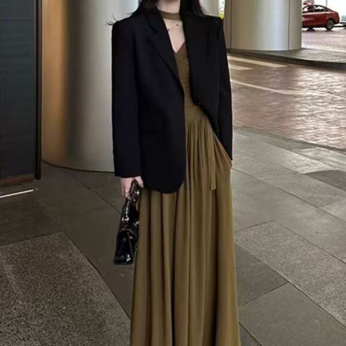 ブラックのテーラードジャケットを羽織れば、きちんと感のある女性らしいスタイルが完成。ビジネスシーンやフォーマルなお出かけにぴったりで、ヒールを合わせるとさらに美シルエットが際立ちます。